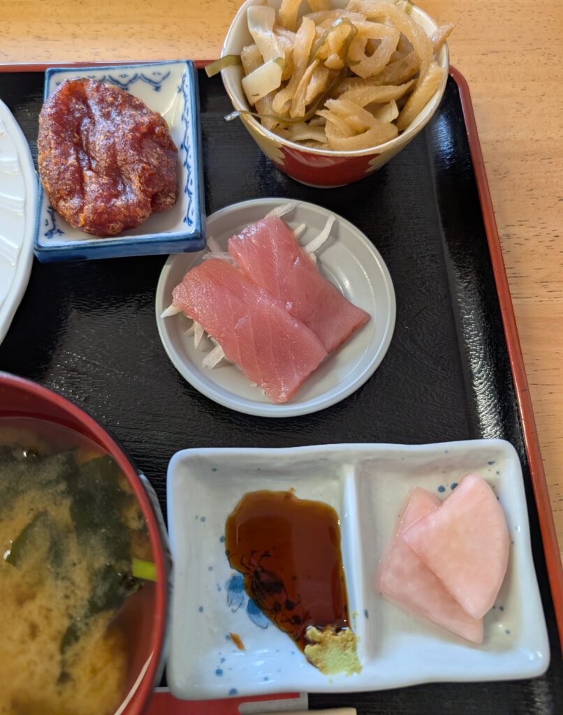 副菜のイリチーや、刺身、漬物とデザートのうむくじてんぷらもカラッと揚がって中はもちもち