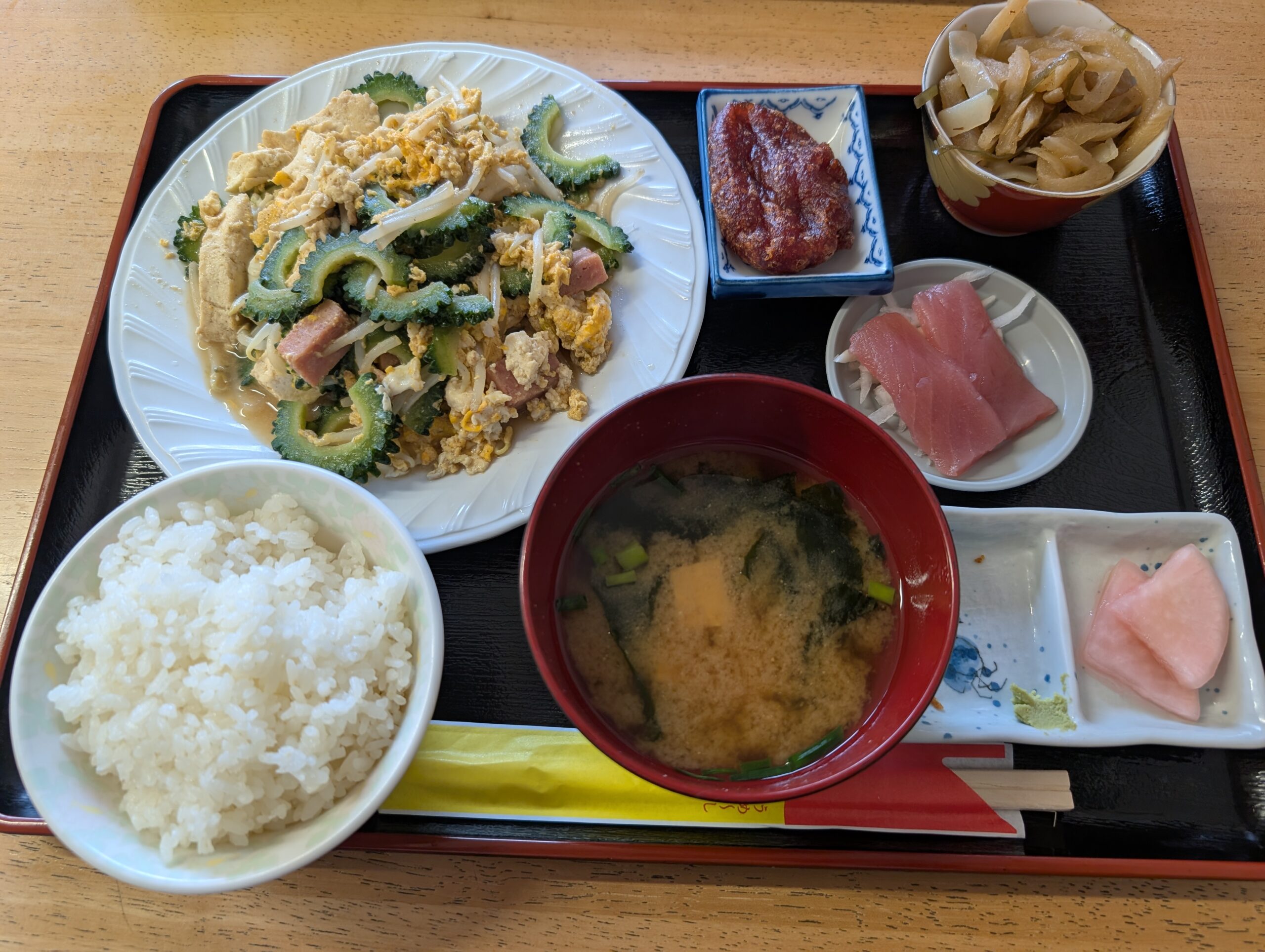 副菜のイリチーや、刺身、漬物とデザートのうむくじてんぷらもカラッと揚がって中はもちもち