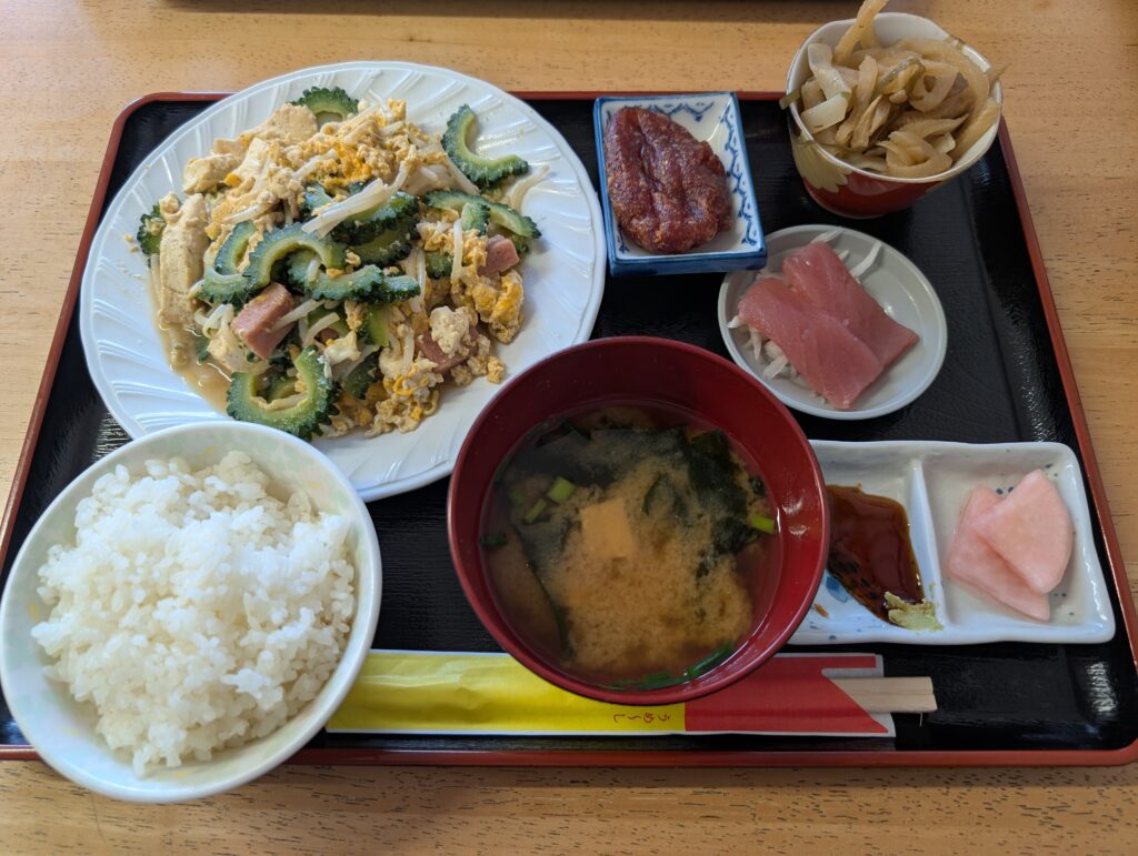 先ずゴーヤーチャンプルーがうまい! うむくじ天ぷらがカラッと揚げられていて、衣はサクサク、中はジューシー。おかずの種類も多く、ボリュームも満点です。